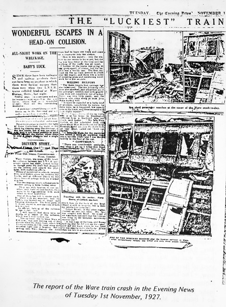 Dr LOWERY: (speaking after the meeting had taken a coffee break): Over the break, Dr May has brought us this clipping from the Daily Mail for November, but we do not know the year. Does anybody remember a head-on smash at Ware Station, which is headlined "Fog Collision of L.N.E.R. Trains - 11 people hurt - girls escape in wrecked coach". Can anybody put a year to that?