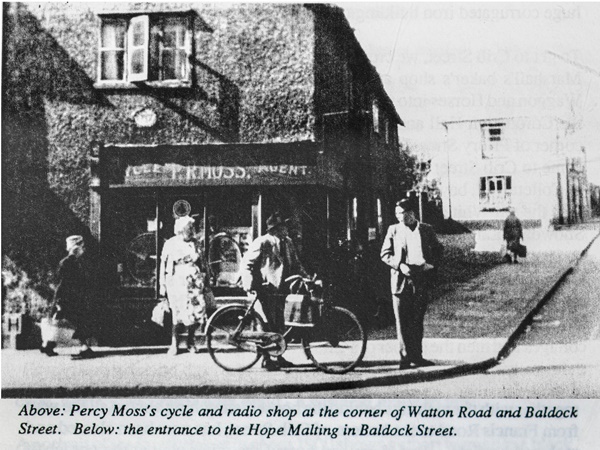 It is still quite easy to gain an idea of the boundaries of Ware at that time by reference to the rows of Edwardian/Victorian villas - for example, if you walked up Trinity Road you had the villas on your left and on your right allotments and open fields as far as you could see. The left side of Tower Road was built in 1924. But much has disappeared within the town, so let us take a little walk up Watton Road to get some idea of what has gone. On the corner, at 49 Baldock Street, was Percy Moss’s cycle and radio shop. The living room was behind the shop and the window looked out over Watton Road. Behind the shop was a range of outbuildings, already rather dilapidated, where Mr Moss carried out his repair work. Then there was a short row of cottages, faced with tarred overlapping boards, and in front of them an open cobbled area. The Chequers pub still stands as does the cottage next door (No 17), but beyond that was a row of four or five small cottages, with steps down into the living room. Uncle Horace and Aunt Flo and their family lived here: they had a living room, scullery and two bedrooms with the WC across a yard paved with blue bricks up against the high wall of the Ware Brewery. Adjacent to the cottages was The Brewery Tap, kept by Mr James King, and tucked into the corner of Park Road were yet more cottages.