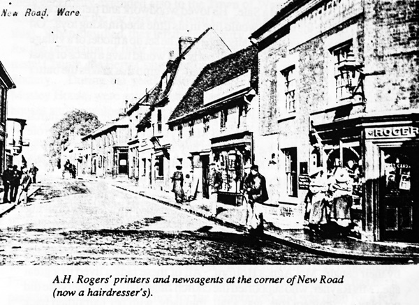 Beyond the New Rose and Crown was a row of about half a dozen cottages, fronted with plaster and boarded up to about three feet, with stable doors. The biggest house on this side of the road was Tidey's Farmhouse (No 55), double fronted with big windows, and used as a dairy and shop, then there were Nos 61 and 63 which still stand. Close by was a black malting extending through to Park Road, which later became the workshops of Crooks the builders, and a sizeable field with the Rose and Crown in the corner. Beyond this, the really big field behind the hedge belonged to John Page, the corn chandler in the High Street and Captain of Ware Fire Brigade, who also owned the little terrace of cottages built with Hitch bricks, still there today. Yet more timber fronted cottages (where I think my father was born) stood at the lip of the old gravel pit, bounded by Wengeo Lane.