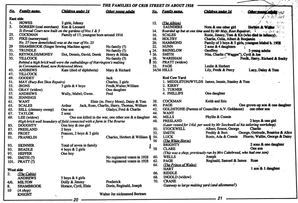 There were lots of children living in Crib Street at this time. Next door to us at Nos 34-36 lived Mr and Mrs Hills, whose family included Lillie, who wore a leg iron, Fred and Percy. At No 26, we had the family of Ware worthy, Mr Charlie "Wagger" Smith, who opened the town's first supermarket much later. Wagger's father was a roly-poly sort of man, nicknamed "Pudden" and Charlie had two brothers, Joe and Cyril, and a sister. Horace and Elsie Shambrook lived at No 8, Rosie and Tom Scales at No 16 and Bert and Ben Holtby and their sister Celia at No 18. Stanley, Jimmy and Jenny Middleton lived in Red Cow Yard and Eric and Keith Cockman at No 38 Crib Street. Further up the street lived the Stockwells, the Lucks, another family named Smith, the Moneys, the Wells's, another Page family, and at the top the Franklins, the Beadles and other families, many of whom were moved out to the new council houses in Canons Road, Fanhams Road or Cundalls Road.