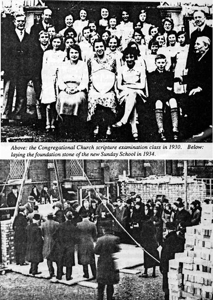 Aunt Rose used to say that I went to the Congregational Sunday School because they took toddlers of three, younger than the children taken by other churches. I suspect that the real truth was different. Although Aunt Rose was Church all her life and Granny Page also went to St. Mary's Mothers' Union, which was held each Monday afternoon in the Vicar's Room in Church Street, on the other hand Aunt Daisy and Uncle Alf were active workers at the Congregational Church and Aunt Daisy took the infants' class on Sunday afternoons. Sunday School was held in the building erected in 1850 "at the exclusive cost of Joseph Chuck, Esq., of Widbury House", as it says on the foundation stone (the school has recently been converted into housing as part of Leaside Walk). The original building consisted of two large rooms on the ground floor and one long room above, approached by a central staircase. All the rooms were furnished with forms and a few tables. The infants met morning and afternoon in one of the ground-floor rooms and the Bible Class met in the afternoon in the other. During the week, this room was used by Miss Farrow's private school and was let in the evening to various charitable groups. Alongside the Chapel was a corrugated iron structure, called the Iron Room, and this was used by the older boys and girls on Sundays and for a variety of meetings during the week.